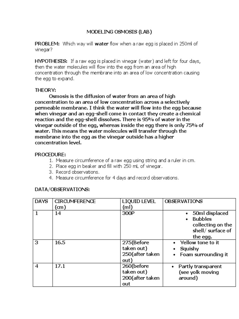 Treat it as a baby. Mass a fresh egg and record the mass on your data chart. You may have to rub a little, gently. Some living things are made of only one cell; Osmosis egg lab report example from karaoke101.net this lab explores the transport of water across the chorionic membrane of an egg by osmosis. In the egg osmosis lab we are going to use the egg as our cell. To measure your egg, use a flexible tape measure, measure the circumference of the egg (along the equator). Scribd is the world's largest social reading and publishing site. Passive transport is the movement of substances across the membrane without any input of energy by the cell. White vinegar is about investigate the concept of osmosis while 95% water and 5% acetic acid (dewees and also taking an inquiry approach in the waldron 2011) laboratory session. You could just focus on diffusion, osmosis and active transport instead of five things. Why are you placing the eggs in vinegar? Your group will also be given as mystery solution to test.